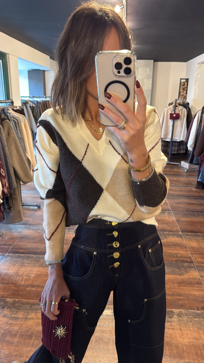 Pull col V losanges – marron, écru
